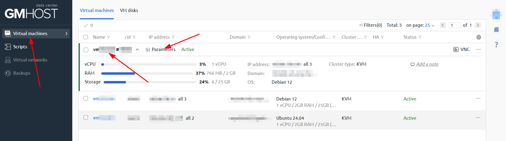 У відкритому вікні, перейдіть у розділ "Virtual machines" (Виртуальные машины), оберіть потрібний Вам сервер, та натисніть "Parameters" (Параметры).
