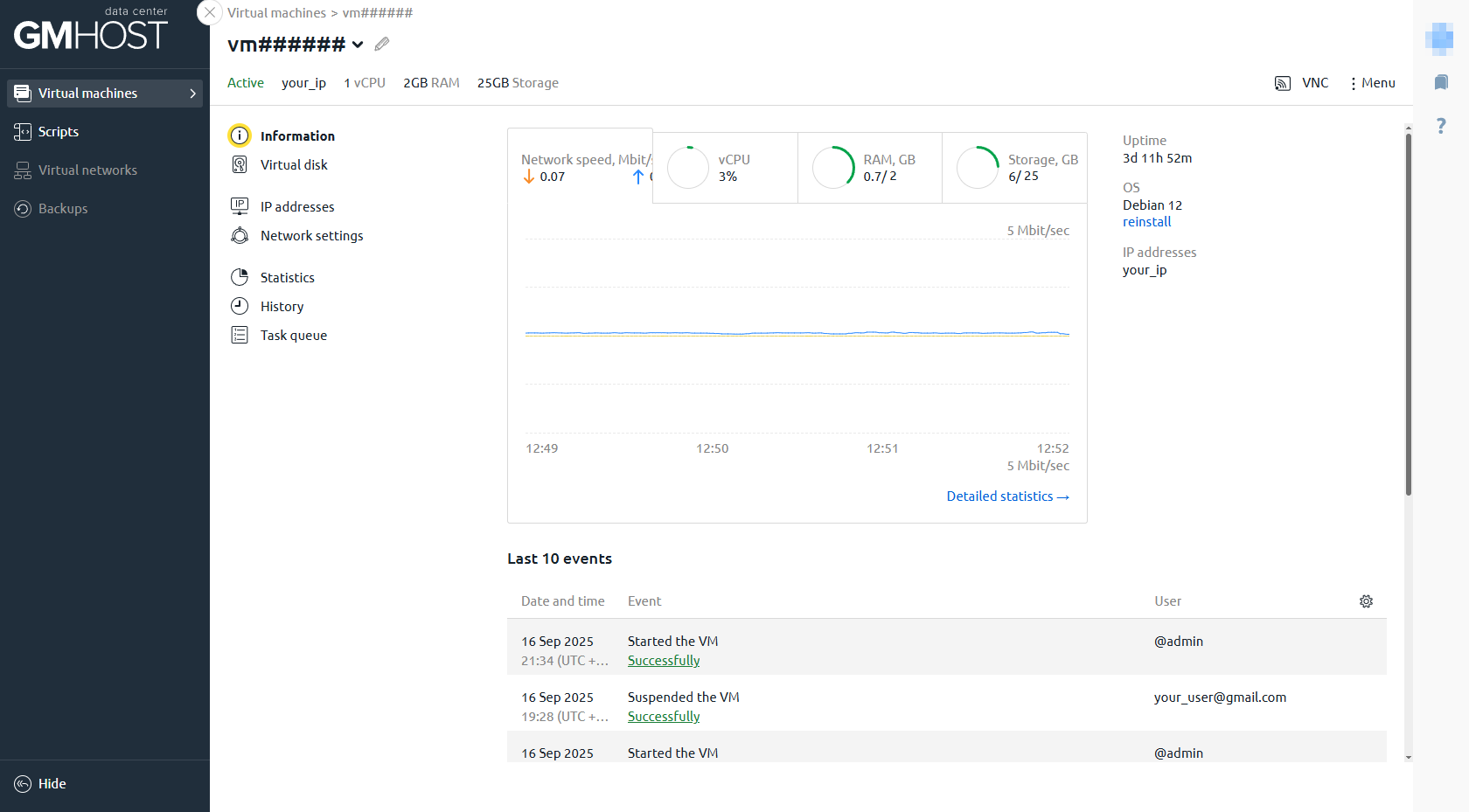 У даному вікні, Ви можете побачити приблизну, або точну статистику навантаження Вашого сервера (за умови встановленого Guest Agent), а також декілька секторів взаємодії із сервером: